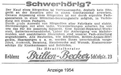 Brigitte Hilgert-Becker: Als Optiker, der sich mit dem Ausgleich eines so wichtigen Sinnesorgans beschäftigte, lag es für ihn nahe, sich auch mit Möglichkeiten zu befassen, Menschen bei nachlassendem Hören zu helfen. Technische Ansätze gab es ja bereits, wenn auch sehr rudimentäre. Schon früh interessierte er sich für diese Entwicklungen. Nach dem Zweiten Weltkrieg engagierte er sich dann sehr stark, auch in der Selbsthilfe – in den 1950er-Jahren wurde er Vorsitzender des Schwerhörigenvereins in Koblenz, der 1937 gegründet worden war, und blieb es bis zu seinem Tod. Hören war für ihn nicht nur eine Profession, sondern auch eine Vision. Mit den Menschen zu arbeiten und sie zu begleiten, das hörte nicht nach Geschäftsschluss auf.